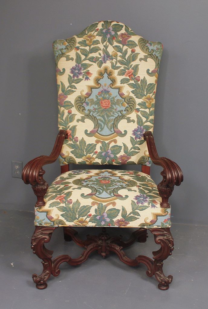 Large Size Rococo High Back Parlor Chair, rolled arms, cabriole legs, curved stretcher, covered in good fabric; 54" h., 28" w. Large Size Rococo High Back Parlor Chair, rolled arms, cabriole legs, curved stretcher, covered in good fabric; 54" h., 28" w.