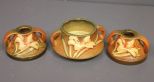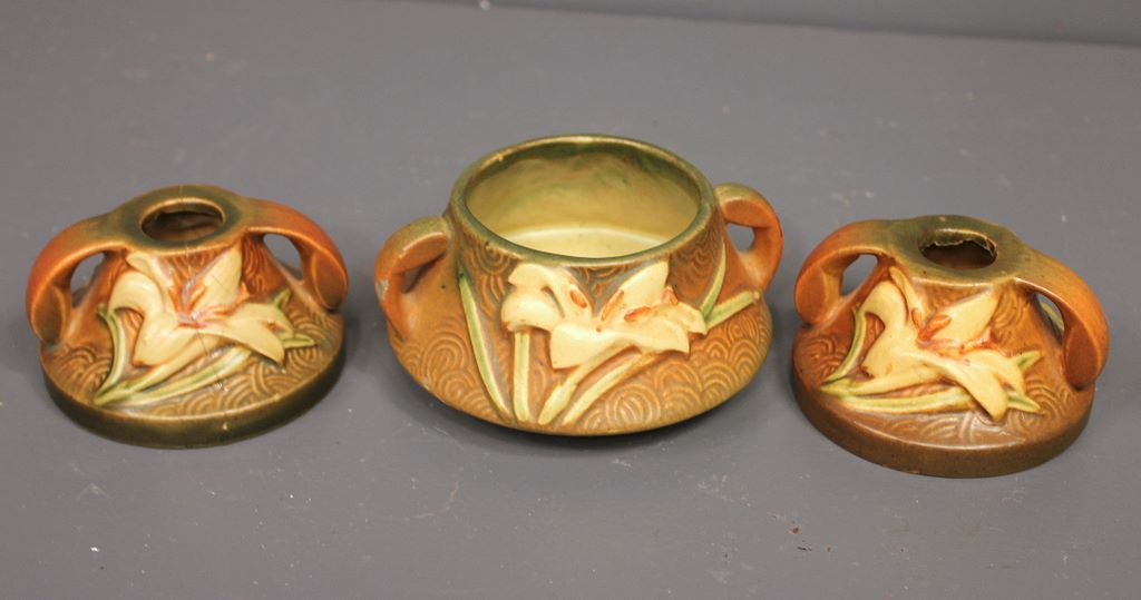 Three Pieces of Roseville, Sephyr Lily pattern. Includes; pair of candle sticks 4" dia., 2 5/8" h. and small bowl, 4 1/2" dia., 2 5/8" h. Three Pieces of Roseville, Sephyr Lily pattern. Includes; pair of candle sticks 4" dia., 2 5/8" h. and small bowl, 4 1/2" dia., 2 5/8" h.