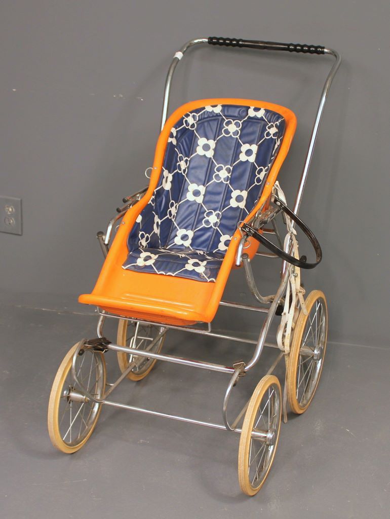 Vintage Stroller, painted orange; 36" h., 39" w. Vintage Stroller, painted orange; 36" h., 39" w.