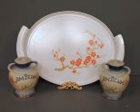 Two Jim Beam Bottles, in shape of vase 5 1/2" h., 4" dia., painted melmac tray 15 1/2" w. Two Jim Beam Bottles, in shape of vase 5 1/2" h., 4" dia., painted melmac tray 15 1/2" w.