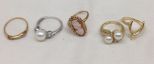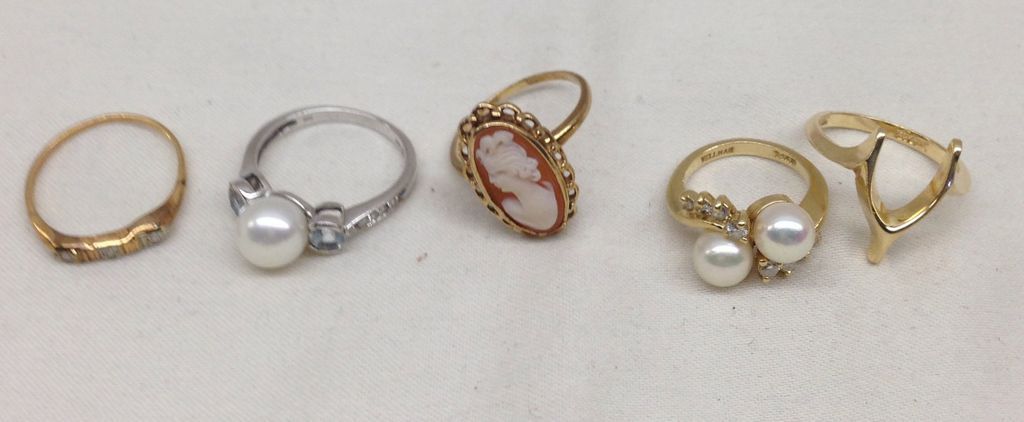 2049 Five Various Lady's Rings One 14K rosecut ring; one pearl and diamond 14K ring; one 10K shell cameo ring; one pearl, diamond, and aquamarine, 14K; one 14K wishbone ring. Sizes Vary.