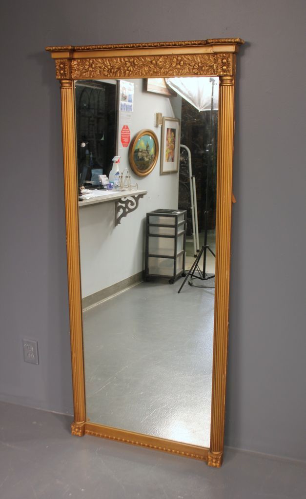 Gold Leaf Large Console Mirror with Marble Top Base, foliage decoration and columns; 27 1/2" w. Gold Leaf Large Console Mirror with Marble Top Base, foliage decoration and columns; 27 1/2" w.