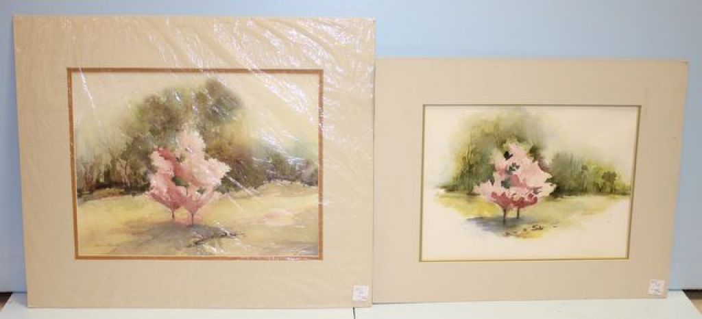 6683 Pair of Paintings of Pink Bushes with Forrest in