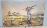 6685 Watercolor of Scarecrow and Home in a Field,
