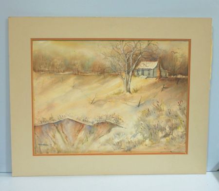 6695 Watercolor of Farmhouse in Field in Fall, signed