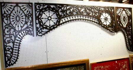 Three gingerbread oak Victorian carved transom; 113" w., 44" h. Three gingerbread oak Victorian carved transom; 113" w., 44" h.