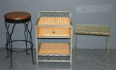 Barstool, One Drawer Side Table and Glass Top Stand Description: Barstool, One Drawer Side Table and Glass Top Stand; wicker one drawer over one shelf stand 28" h., 20" w., 18" d. Barstool, One Drawer Side Table and Glass Top Stand Description: Barstool, One Drawer Side Table and Glass Top Stand; wicker one drawer over one shelf stand 28" h., 20" w., 18" d.