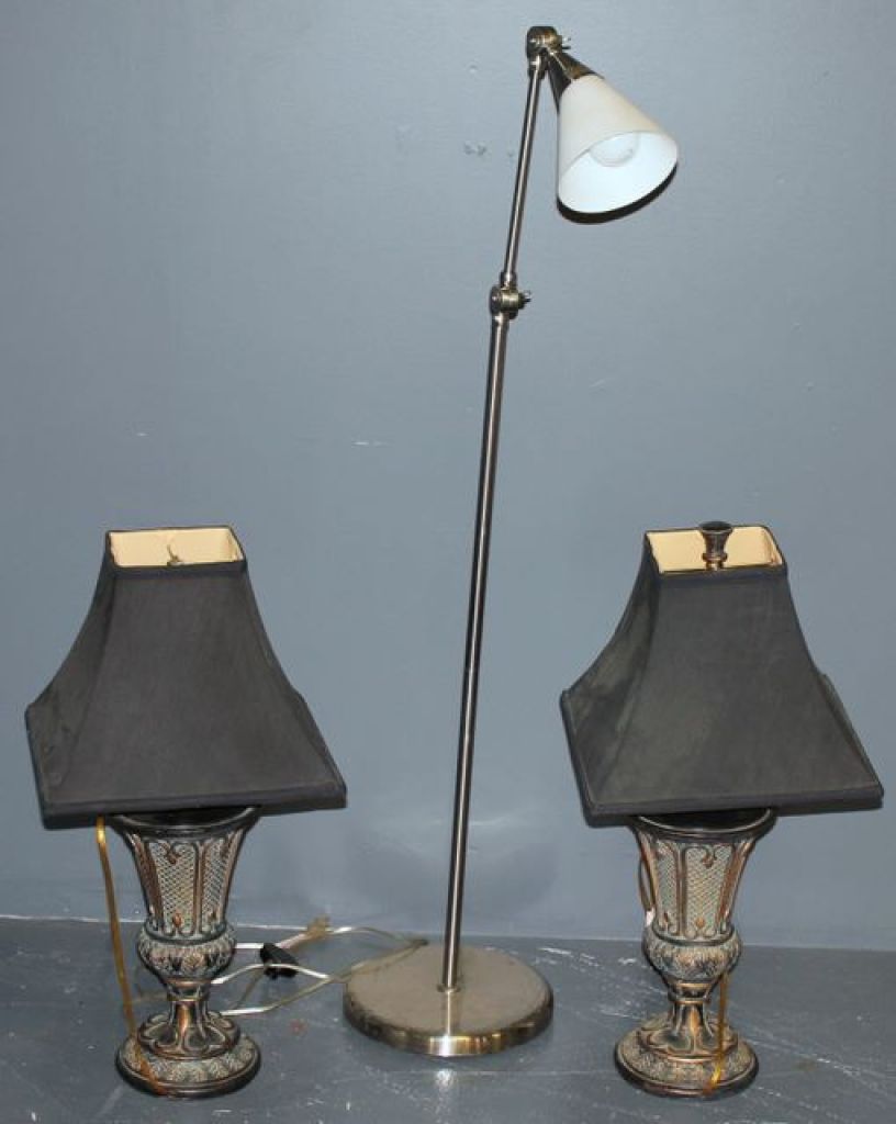 Three Lamps Description: Three Lamps; pair of contemporary table lamps (28" h.), one floor lamp (52" h.) Three Lamps Description: Three Lamps; pair of contemporary table lamps (28" h.), one floor lamp (52" h.)