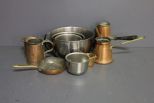 20045 Stainless Mixing Bowls Description: Box lot of 4 stainless steel mixing bowls, 8", 6", 5", 4", also 6 pieces of small copper 5" skillets, small bucket, 2"h, 4 pitchers.