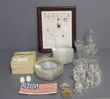 20052 Group of Glass Items Description: Group of Glass Items, group includes; nine 8 1/2" salad plates with gold trim, four boxes of white salt and peppers, American Flag porcelain tray, Copy of the Birmingham News, glasses, cups, twenty one plates