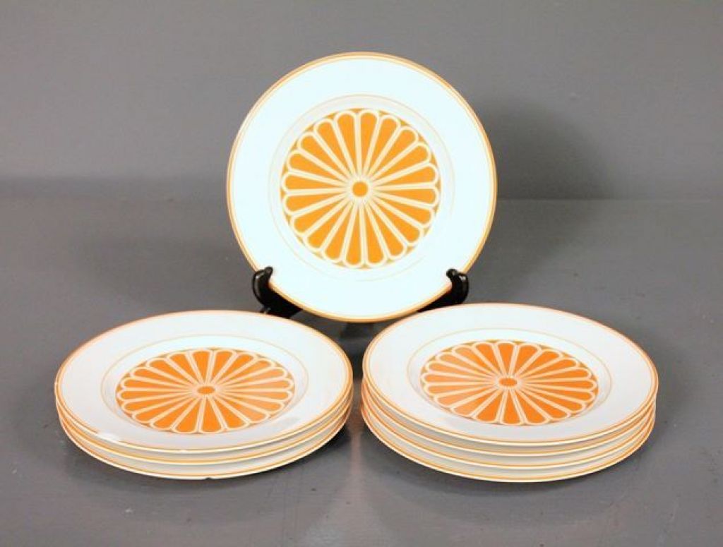 Set of Eight Fitz and Floyd Luncheon Plates Description: Set of Eight Fitz and Floyd Luncheon Plates; white and orange pattern, three with chips on rim; 7 1/2" dia. Set of Eight Fitz and Floyd Luncheon Plates Description: Set of Eight Fitz and Floyd Luncheon Plates; white and orange pattern, three with chips on rim; 7 1/2" dia.
