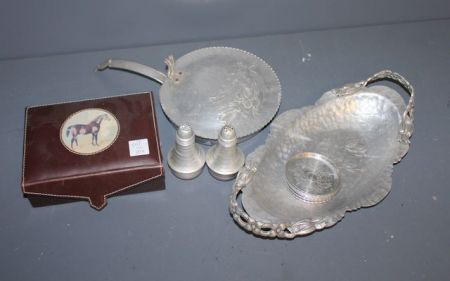 Group of Aluminum Description: Group of Aluminum, including; oval tray (14"), eight coasters, salt and pepper, box with picture of horse Group of Aluminum Description: Group of Aluminum, including; oval tray (14"), eight coasters, salt and pepper, box with picture of horse