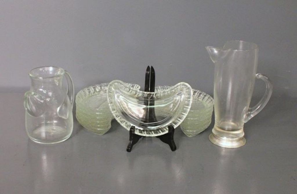20066 Two Glass Pitchers and Thirteen Clear Glass Bone Dishes Description: Two Glass Pitchers and Thirteen Clear Glass Bone Dishes, dishes (8" l., 4" w.) one pitcher is 6 3/4" h., other pitcher is 9 3/4" h.