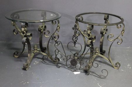 Two Iron Glass Top Tables and Iron Wall Piece Description: Two Iron Glass Top Tables and Iron Wall Piece, glass on one table missing, tables 25" dia., 23" h., wall plaque 32" w., 21 1/2" h. Two Iron Glass Top Tables and Iron Wall Piece Description: Two Iron Glass Top Tables and Iron Wall Piece, glass on one table missing, tables 25" dia., 23" h., wall plaque 32" w., 21 1/2" h.