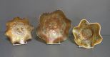 20087 Carnival Glass Bowls Description: Three Carnival Glass Bowls. One acorn and leaves, ruffled edge 7 3/8"dia. One 6 1/2"dia with white ridge on ruffled edge. One 9 7/8", leaf and flower all merigold color.