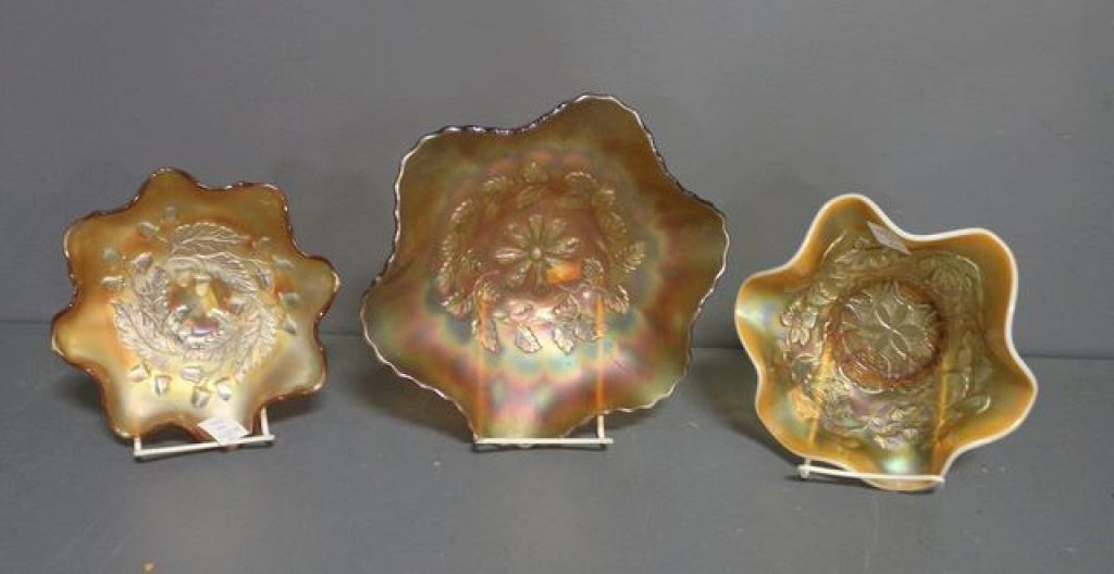 Carnival Glass Bowls Description: Three Carnival Glass Bowls. One acorn and leaves, ruffled edge 7 3/8"dia. One 6 1/2"dia with white ridge on ruffled edge. One 9 7/8", leaf and flower all merigold color. Carnival Glass Bowls Description: Three Carnival Glass Bowls. One acorn and leaves, ruffled edge 7 3/8"dia. One 6 1/2"dia with white ridge on ruffled edge. One 9 7/8", leaf and flower all merigold color.