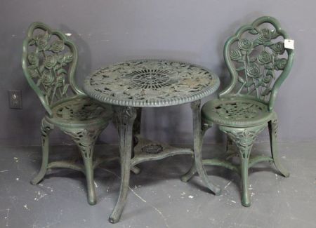 Plastic Three Piece Bistro Set Description: Plastic Three Piece Bistro Set, 26 1/2" dia., 26"h. Plastic Three Piece Bistro Set Description: Plastic Three Piece Bistro Set, 26 1/2" dia., 26"h.