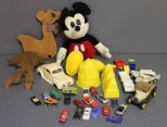 20110 Group of Miscellaneous Toys Description: Large plastic container of toys, Mickey Mouse, model rolls royce (no wheels) lots of small tin race cars, model T, dump truck.
