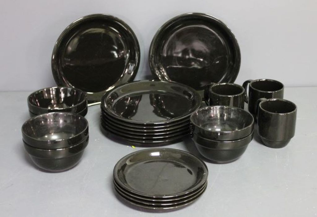 20113 Black Set of Mainstays Dinnerware Description: Black Set of Mainstays dinnerware which includes; 8 dinner plates, 6 salad plates, 6 cereal bowls, 3 mugs.