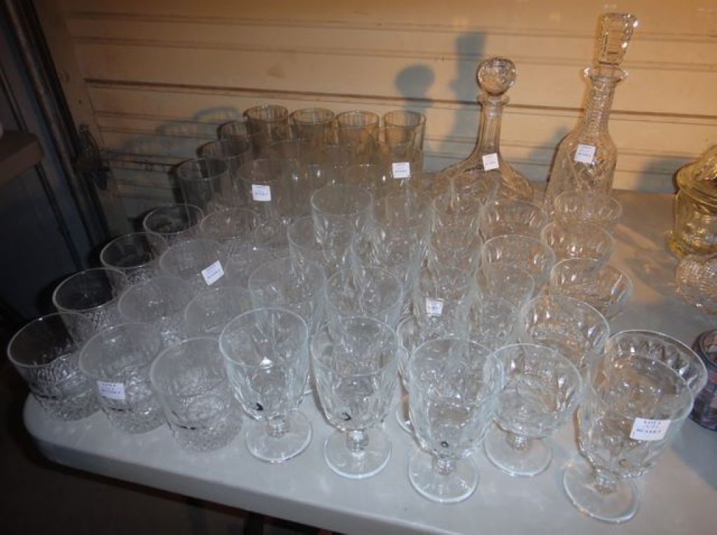 Group of Drinking Glasses along with Two Decanters Group of Drinking Glasses along with Two Decanters; Assortment of whiskey and water glasses, one whiskey glass has a crack Group of Drinking Glasses along with Two Decanters Group of Drinking Glasses along with Two Decanters; Assortment of whiskey and water glasses, one whiskey glass has a crack