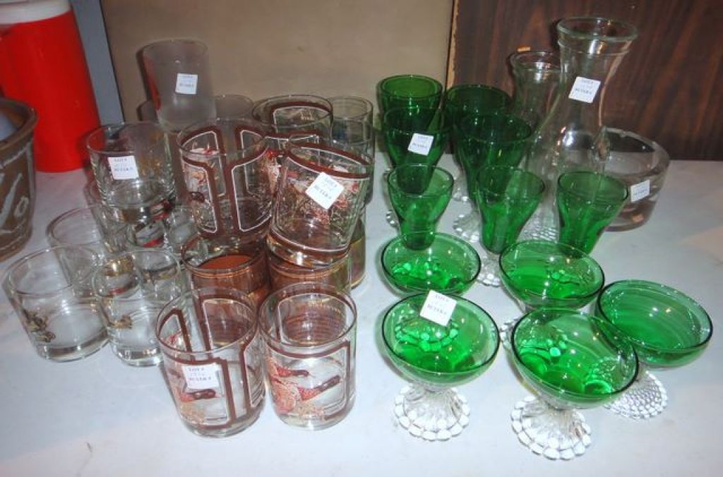 20147 Group of Miscellaneous Glassware Group of Miscellaneous Glassware; included are assorted glasses, two glass water pitchers and glass ashtray; tallest pitcher 11" h.