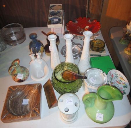 Group of Assorted Decorative Items Group of Assorted Decorative Items, includes; handmade ashtray, three small decorative vases, "Thank You For Not Smoking" sign, toothbrush holder, four small ashtrays, soup holders, milk glass candlestick holders Group of Assorted Decorative Items Group of Assorted Decorative Items, includes; handmade ashtray, three small decorative vases, "Thank You For Not Smoking" sign, toothbrush holder, four small ashtrays, soup holders, milk glass candlestick holders