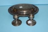 20278 Silverplate Oval Dish with Lid, Pair Small Sterling Weighted Candlestick Silverplate oval dish, 12" w. ; candlesticks, 3" h.