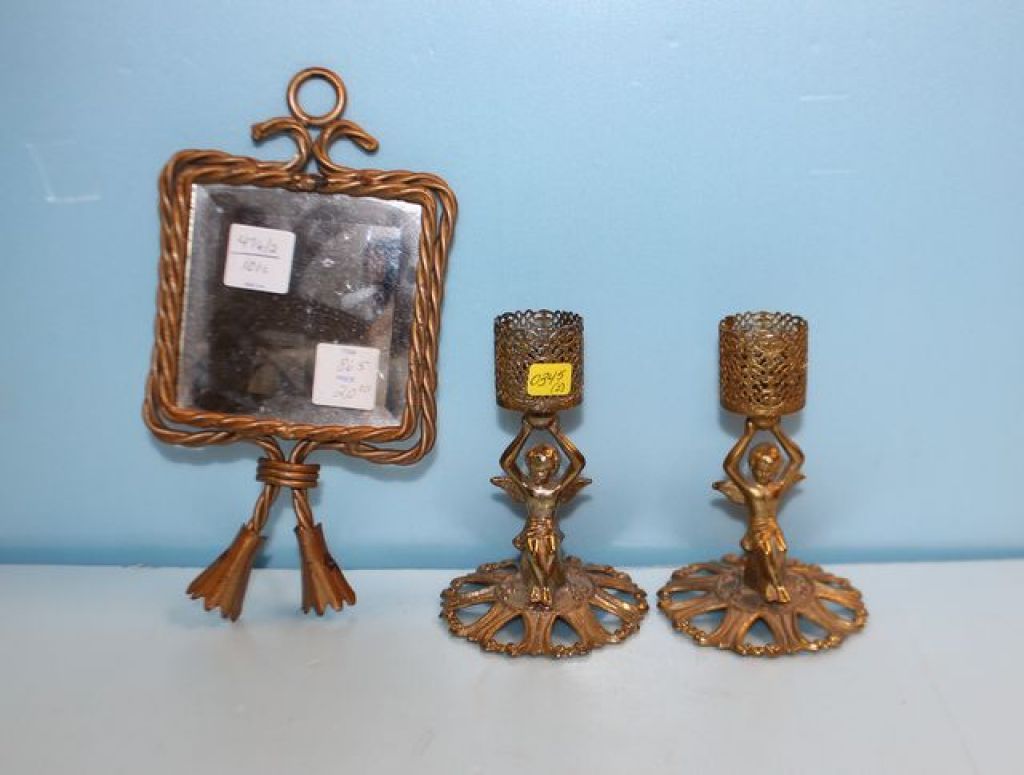 20322 Small Beveled Glass Hanging Mirror and Two Cupid Candlesticks Mirror, 4 1/2" w., 9" h.