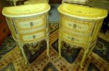 Pair of French Side Tables Pair of French two drawer demilune side tables, decorated with floral motif - 29"h. x 19"w. x 11"d. Pair of French Side Tables Pair of French two drawer demilune side tables, decorated with floral motif - 29"h. x 19"w. x 11"d.