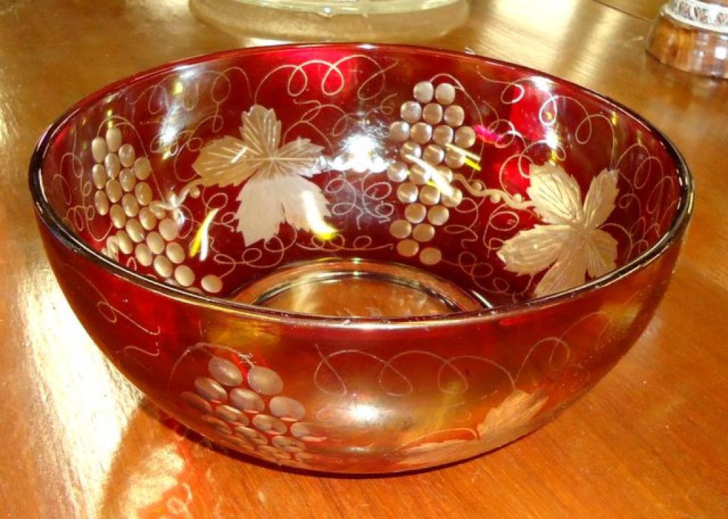 Red Glass Bowl Bohemian Ruby red bowl with cut to clear grape design - 4"h. x 9 3/4 diameter Red Glass Bowl Bohemian Ruby red bowl with cut to clear grape design - 4"h. x 9 3/4 diameter