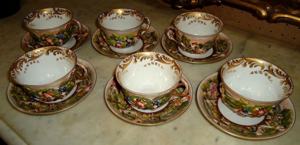 Capodimonte Hard Paste Porcelain Coffee Cups & Saucers Set of 6 capodimonte hard paste porcelain coffee cups, late 19th century - cups 2 1/2" x 4" (excluding handles), saucers 6"w. Capodimonte Hard Paste Porcelain Coffee Cups & Saucers Set of 6 capodimonte hard paste porcelain coffee cups, late 19th century - cups 2 1/2" x 4" (excluding handles), saucers 6"w.