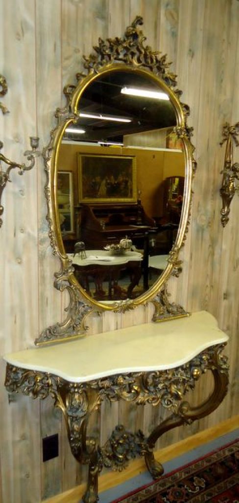 Early 20th Century Gilt Console & Mirror Early 20th century gilt console, roccoco style with marble top and gilt mirror - 61"h. x 37 1/2"w. Early 20th Century Gilt Console & Mirror Early 20th century gilt console, roccoco style with marble top and gilt mirror - 61"h. x 37 1/2"w.