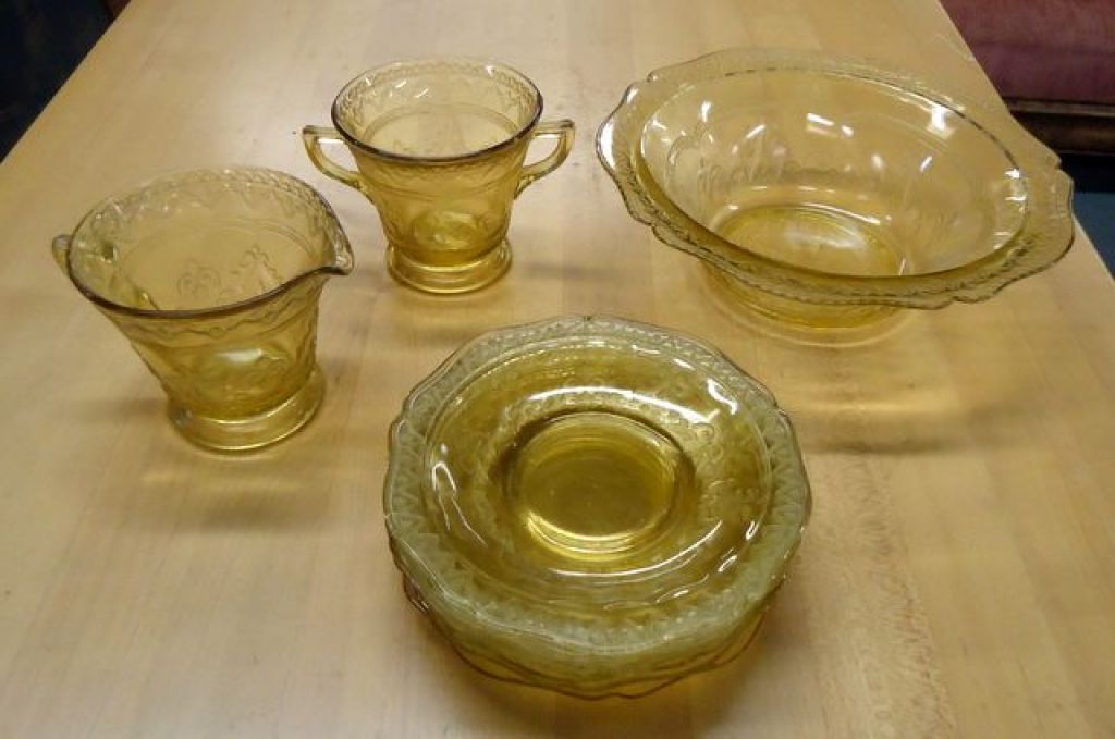 Depression Sugar/Creamer Bowl and Saucers Depression sugar/creamer bowl 2 3/4" x 9" w. and saucers 5 3/4" Depression Sugar/Creamer Bowl and Saucers Depression sugar/creamer bowl 2 3/4" x 9" w. and saucers 5 3/4"