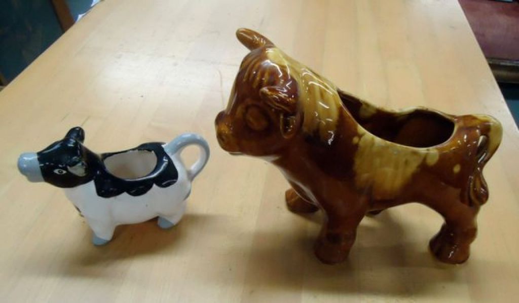 20575 Bull and Cow Brown bull 6 3/4"h, black and white cow 3 3/4"h