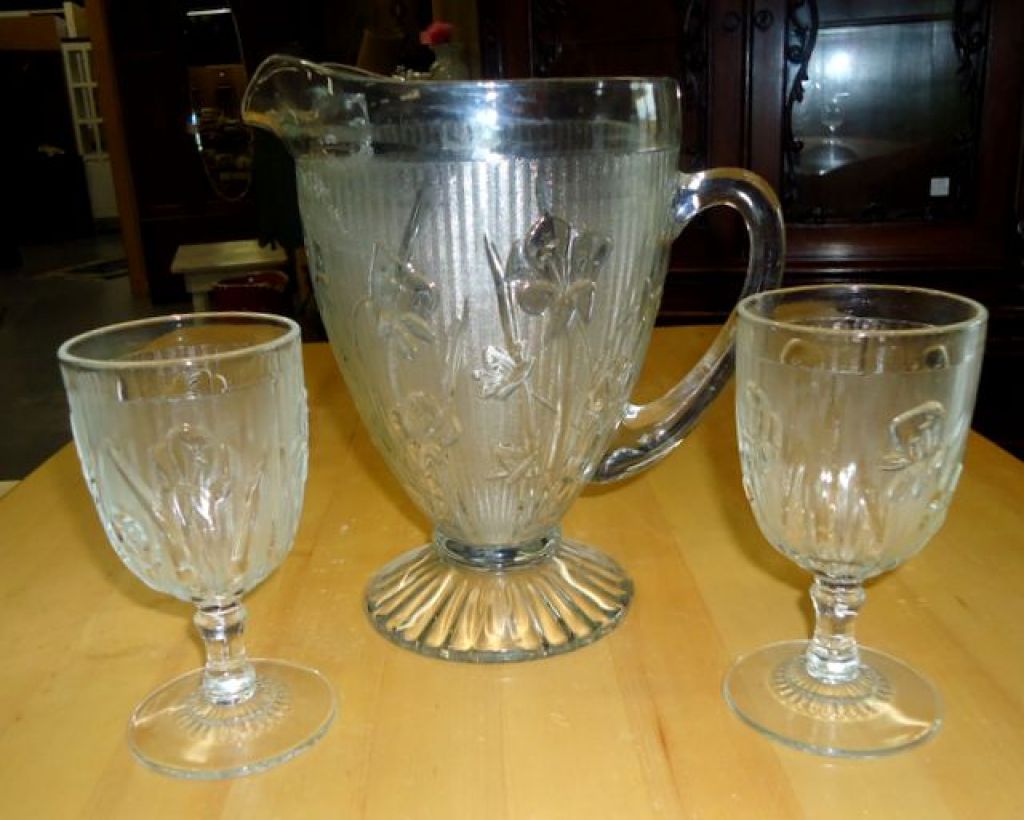 Pitcher and two glasses with flowers Pitcher and two glasses with flowers 14 1/2"h. Pitcher and two glasses with flowers Pitcher and two glasses with flowers 14 1/2"h.
