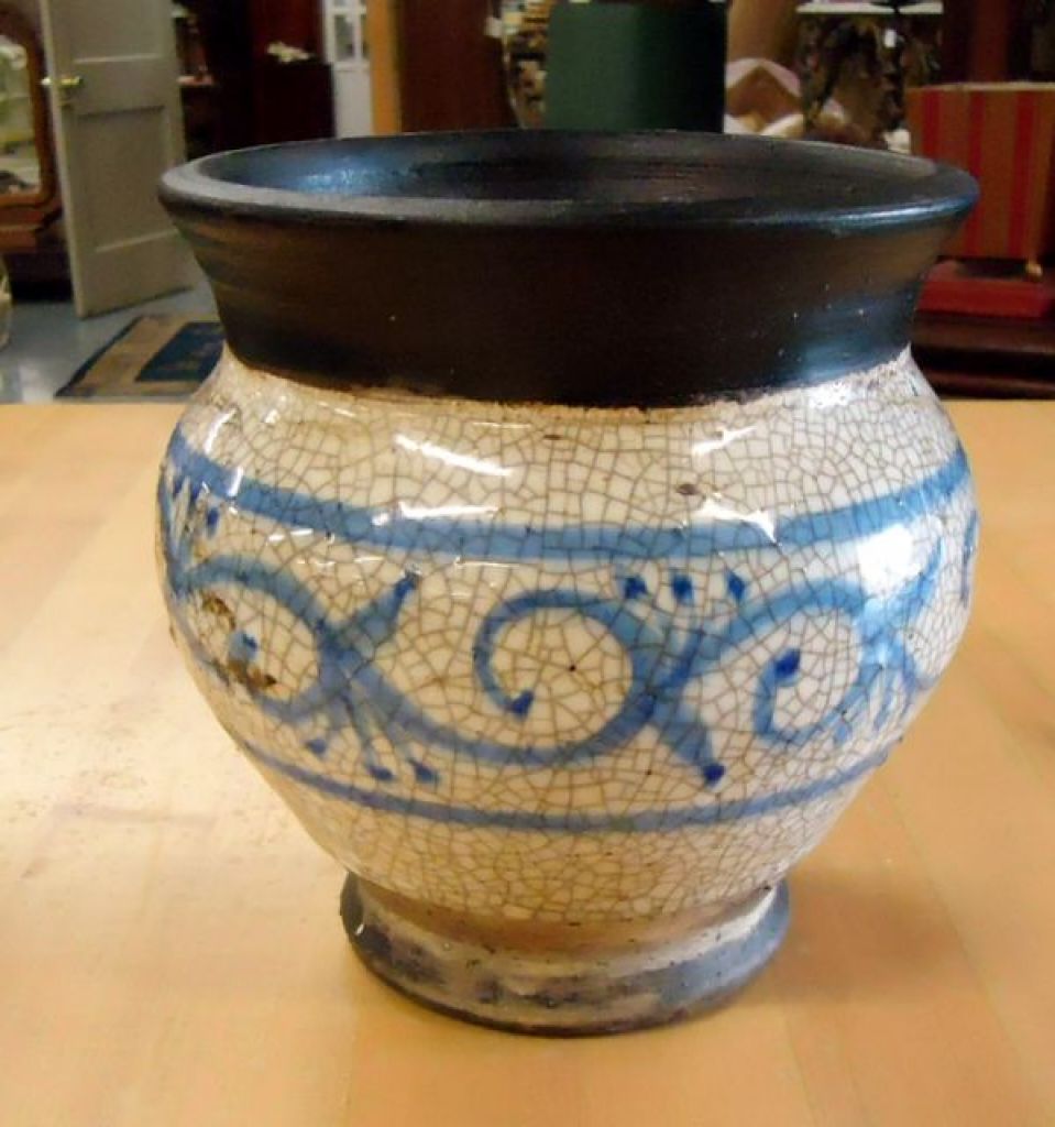 20683 Pottery Jar Black and white pottery jar with blue markings 7"