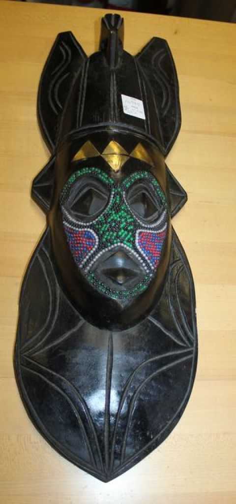 20887 Wood Carved Ghana Tribal Mask Wood Carved Ghana Tribal Mask, colorful beading on front; 19' h., 6" w.