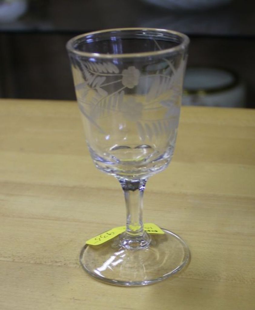 Etched Glass Footed Sherry Glass Etched Glass Footed Sherry Glass; 4" h. Etched Glass Footed Sherry Glass Etched Glass Footed Sherry Glass; 4" h.