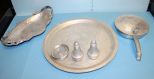 21102 Lot of Vintage Alluminum Tray, Oval Basket/Tray, Salt and Pepper, Seven Coasters, and Dust pan Lot of Vintage Alluminum Tray 14"dia., Oval Basket/Tray 14", Salt and Pepper, Seven Coasters, and Dust pan