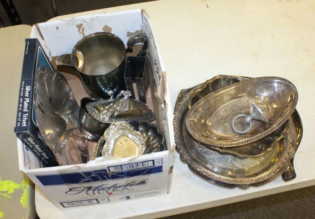 Box Lot of Silverplate Includes: Trays, Trivet, and Pitcher. Box Lot of Silverplate Includes: Trays, Trivet, and Pitcher.