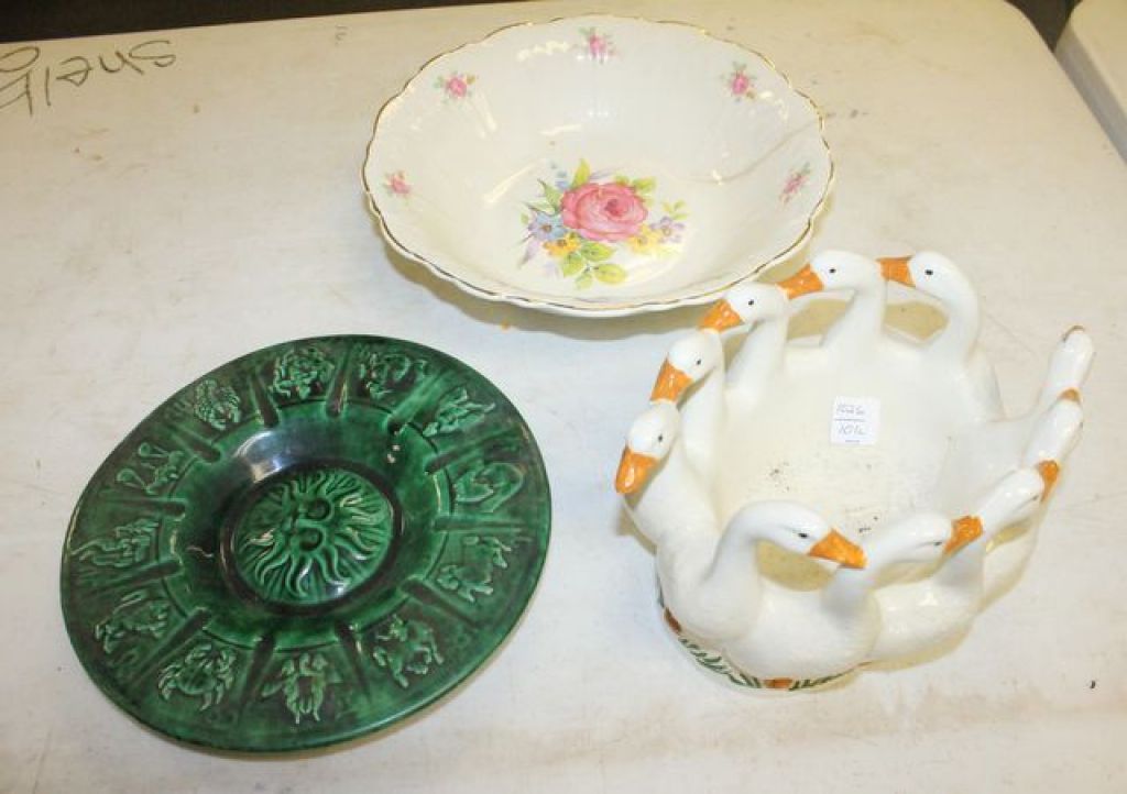 21114 Ceramic Duck Centerpiece, Vintage Bowl, and Zodiac Ceramic Dish Ceramic Duck Centerpiece 6"dia., Vintage Bowl, and Zodiac Ceramic Dish 10"dia.