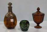 Small Green Cut Glass Rose Bowl, Decanter, and Amber Convered Candy Dish Glass rose bowl 3" dia., 4" h. ; decanter was made is Holland Small Green Cut Glass Rose Bowl, Decanter, and Amber Convered Candy Dish Glass rose bowl 3" dia., 4" h. ; decanter was made is Holland
