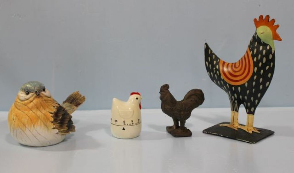 21190 Jessin Bird, Iron Rooster, Metal Painted Rooster, and Porcelain Egg Timer Iron rooster 3" h. ; painted rooster 8" h.
