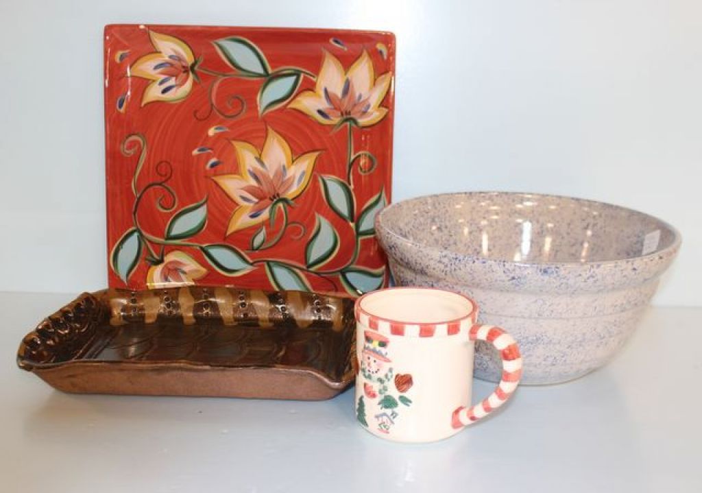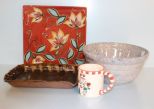 Gail Pittman Square Painted Tray, Pottery Rectangular Tray, Western Stoneware Bowl, and Mug Painted tray 13" ; rectangular tray 12 1/2" ; stoneware bowl 12" dia. Gail Pittman Square Painted Tray, Pottery Rectangular Tray, Western Stoneware Bowl, and Mug Painted tray 13" ; rectangular tray 12 1/2" ; stoneware bowl 12" dia.