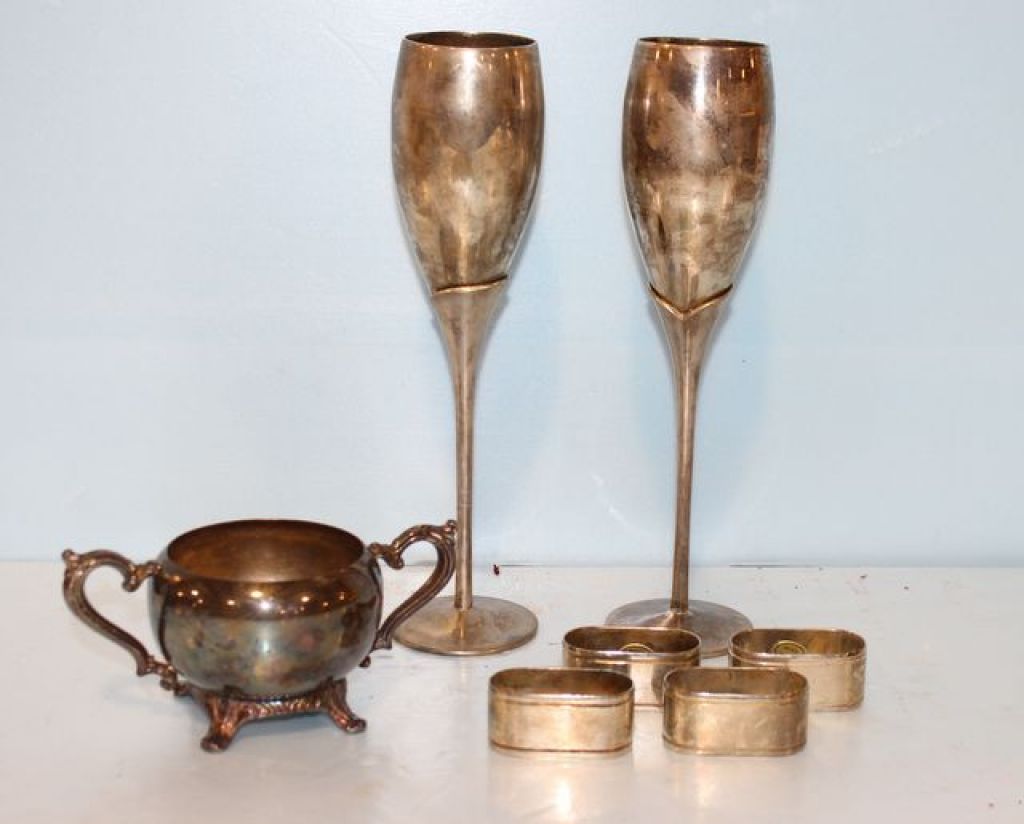 Made in China Pair Tulip Design Silverplate Wine Glasses, Four Plated Napkin Rings, Silverplate Sugar Bowl Made in China Pair Tulip Design Silverplate Wine Glasses, Four Plated Napkin Rings, Silverplate Sugar Bowl