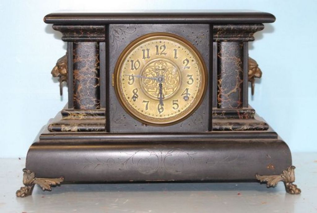Victorian Wood Mantel Clock Painted black and faux grain mantel clock with brass lions head rings and paw feet; missing pendulum Victorian Wood Mantel Clock Painted black and faux grain mantel clock with brass lions head rings and paw feet; missing pendulum
