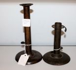 21860 Two Pushup Metal Candlesticks 5 1/2" h., 7" h.