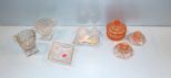 Group of Various Glass Pieces Including candlesticks, jar, creamer, sugar, two nut dishes Group of Various Glass Pieces Including candlesticks, jar, creamer, sugar, two nut dishes