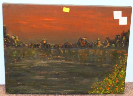 Dark Oil on Canvas of Mountains and Lake 13" w., 12" h. Dark Oil on Canvas of Mountains and Lake 13" w., 12" h.