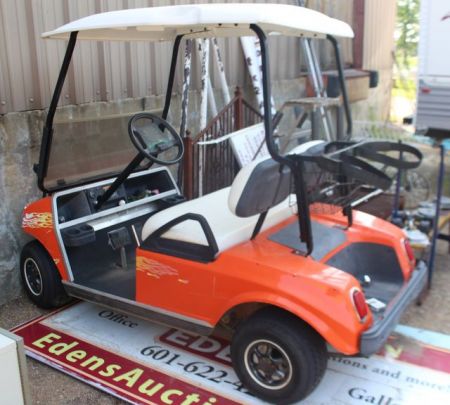 Early 2000's Club Cart Gas powered golf cart, orange, will run. Early 2000's Club Cart Gas powered golf cart, orange, will run.